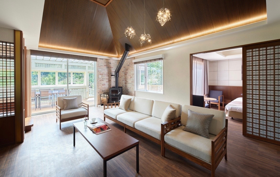 ☀︎今回は、グランピング・ヴィラに5人+愛犬で宿泊しましたが、お部屋の中がとにかく広く、室内にはジャグジーバスやキッチンなどがありました!そしてなにより驚いたのが、お部屋に暖炉があることです!